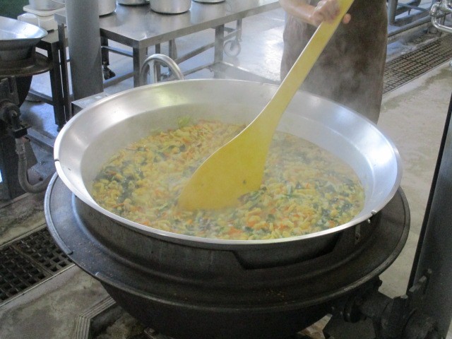 さけのスパゲッティは、給食室3台の釜フル稼働で作ります。2釜でルウを作り、1釜で麺をゆでます。紅ざけフレーク、ベーコン、スパゲッティ、たまねぎ、にんじん、グリンピース、マッシュルームが入っています。できあがると、さけのピンク色とグリンピースの黄緑が浮かびあがって春らしい献立です。