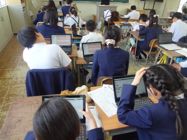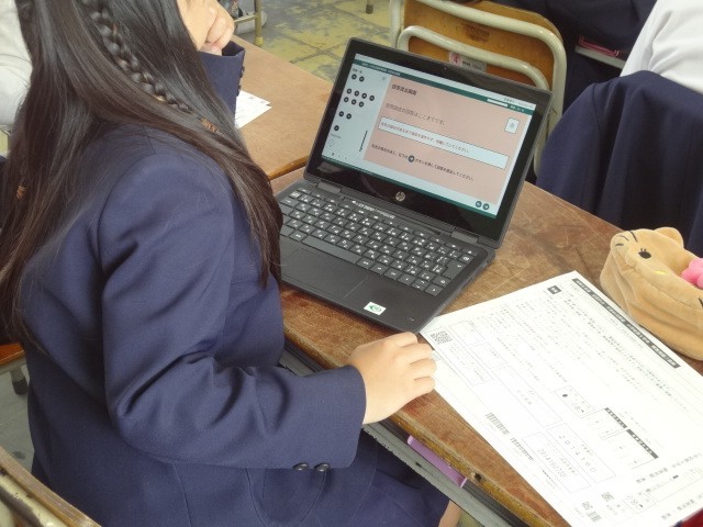 今年より6年生では、児童質問調査がマークシートや記述式ではなく、学習者用端末によるオンラインで、画面上の選択肢をクリックしたり、キーボードで文字を入力したりする回に変わりました。