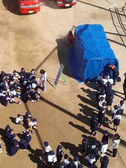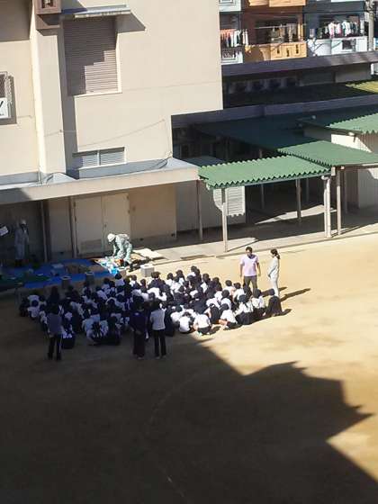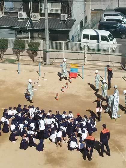 運動場では、水消火器訓練と煙中訓練を行いました。また、災害用備蓄物品も見せていただきました。