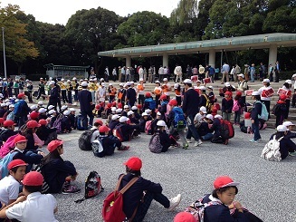 緑地公園に集合しています。高学年が低学年を迎えに行っています。