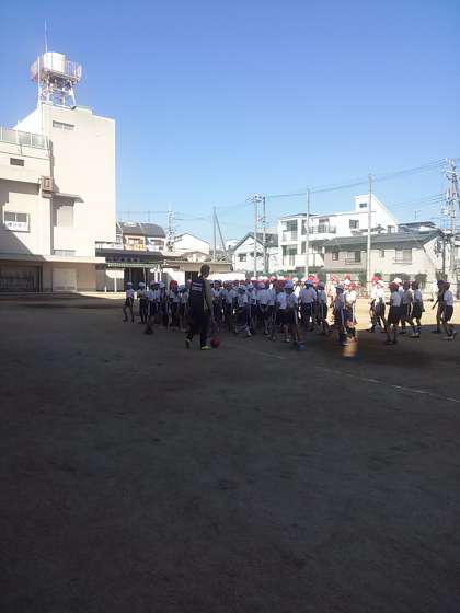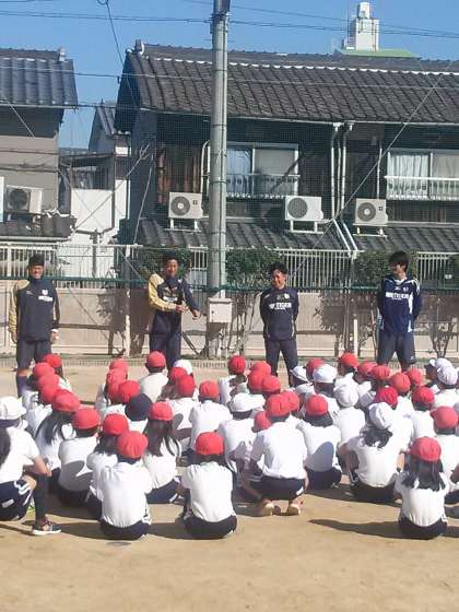 先週の6年生に引き続き、セレッソ大阪の選手やコーチの方々に来校いただきました。まずは、準備体操と挨拶! 大きな挨拶の声が運動場に響きました