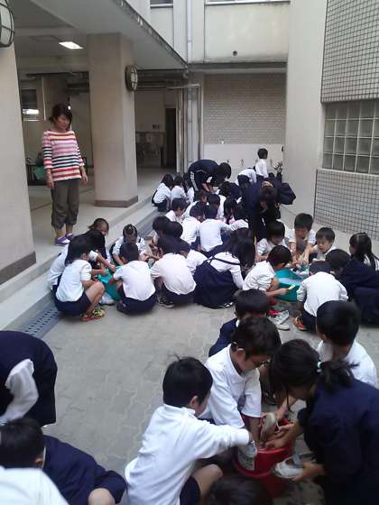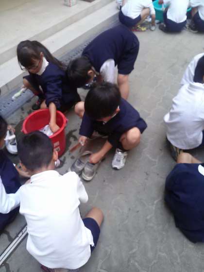1年生が生活科の学習で上ぐつを洗うという活動を行いました。いつもお家の人に洗ってもらっている人達もこれからは自分で洗おうね!(^^)!