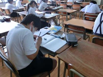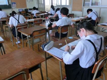 これまで臨時休業が続き、臨時休業中のこれまでの「登校日」は実質的に課題に取り組む時間は1時間半がせいぜいだったので、3時限の授業はとても長く感じるはずです。でも、集中力を失っている子や私語をする子は1人もいません!特にお昼ごはんを食べたあとの午後の部の3時限は睡魔もおそってきそうなものですが、みなさん、ほんとうにえらいな、頑張っているなと思いました。
