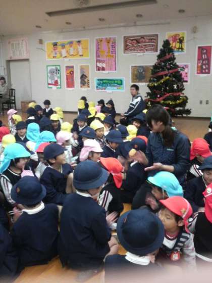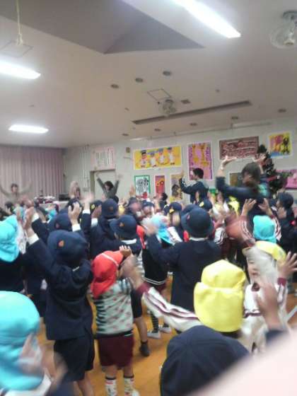 1年生が隣の姫島幼稚園で開催されている展覧会を見学しにいきました。その際、交流の一環として幼稚園のお友達と音楽に合わせて手遊びをしました。