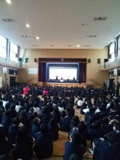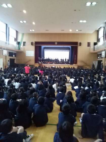 今日の集会は、保健委員会の発表です。健康や体に関わるクイズがあったり、ビデオ上映が行われたりしました。