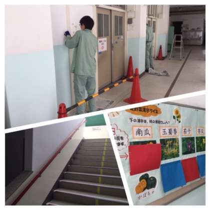 職員室に戻ってこようとすると、管理作業員さんが、綺麗に壁の塗装をしてくれていました。先日は、管理作業員さんの合同作業で、東階段の壁も綺麗に塗りなおされています。いつも施設の安全点検や美しく保つための作業に取り組んでくれています。
