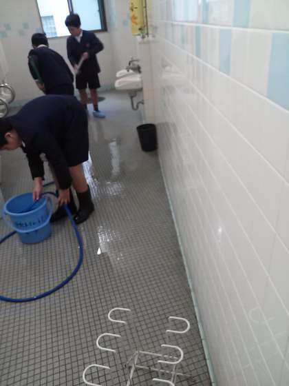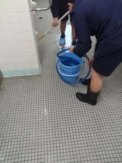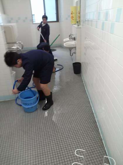 いつもこのトイレをきれいにしてくれているメンバーのうちの3人です。清掃道具のホースまでこのようにきれいに巻いています。プロ並みの仕事です!!!