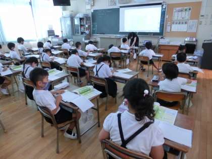 ■3年生は国語の時間。「サーカスのライオン」の物語を先生が読み聞かせています。読み終えた後、先生から物語の内容についての問いかけがありました。みんなきっちりと内容をつかめたようです。