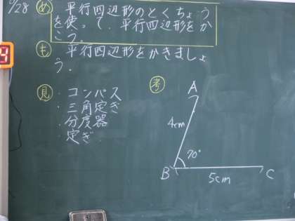 算数の授業で、「平行四辺形の書き方」を学習していました。