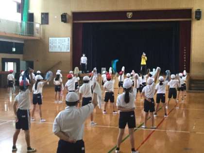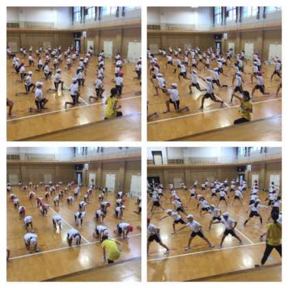 体育館を割り当てし、毎時間、どこかの学年が運動会の「団体演技」の練習をしています。まだまだ始めたばかりなので、動きを覚える段階ですが、学年のみんなで1つの作品をつくる経験はすばらしいものです。感染拡大防止に気を配る必要はありますが、ぜひ、子どもたちに体験させたい取組です。
