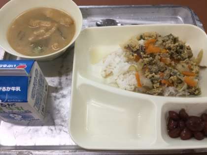 今日の給食は ■他人丼 ■とうがんのみそ汁 ■金時豆の煮もの ■ごはん ■牛乳 の献立です。