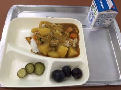 今週さいごの給食は、■米粉のチキンカレーライス ■きゅうりのピクルス ■ぶどう(巨峰) ■牛乳 の献立でした。