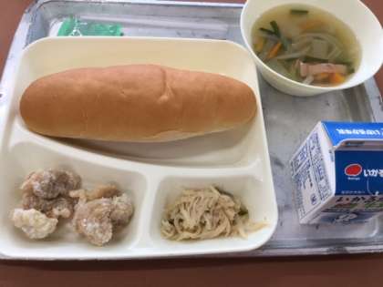 午前中の授業や運動会の取組をがんばり、給食の時間は、ほっと一息つける時間です。今日の給食は、■鶏肉のからあげ ■とうがんの中華スープ ■切干しだいこんのごま辛味づけ ■コッペパン ■牛乳 という献立でした。