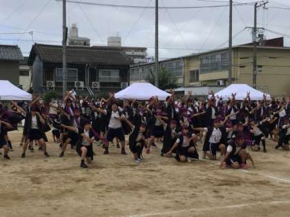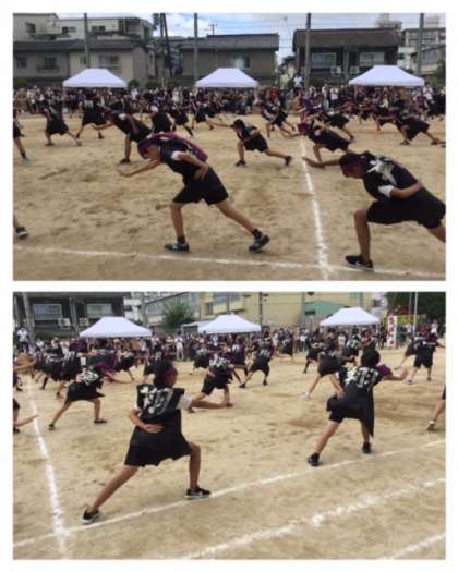 そろいの黒いハッピと紫のハチマキがまさにクールです。津軽三味線の迫力ある音色が響く中、和太鼓でリズムがとられ、6年生の演技も負けない迫力です。テンポも速いし動きも力強い。ダンスというよりも武道の演舞のようで見とれてしまいました。「姫島六年団」まさに応援団のようです。始まりから決めのポーズまで、息をつかせぬ演技がつづきました。さすが最高学年6年生です。「エール」というのは、人を励ます応援の声という意味ですが、6年生の演技からは、下級生をはじめとするまわりの人々への「エール」を強く感じました。