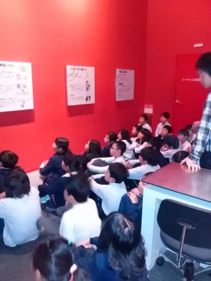 地震体験コーナーに入る前に説明を聞いています。