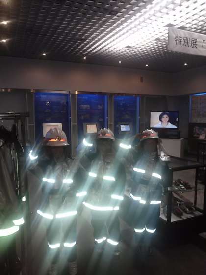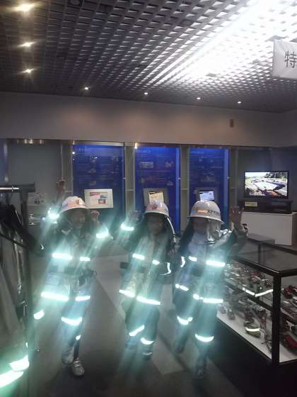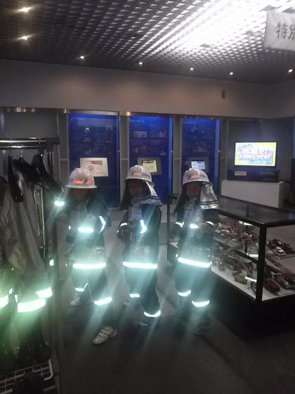 消防服を試着させてもらいました。なんと 光り輝いています。どうしてかな?