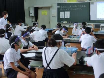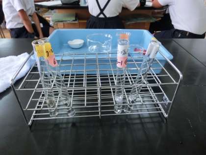 3限に6年生の授業をのぞいてみると、2組が理科室で化学の実験をしていました。塩酸にスチールウール・アルミ箔を浸すとどのような変化がおきるか、水に浸した場合と比較して観察をします。