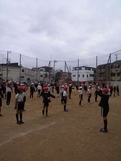 写真は駆け足前の5年生の準備体操の風景です。