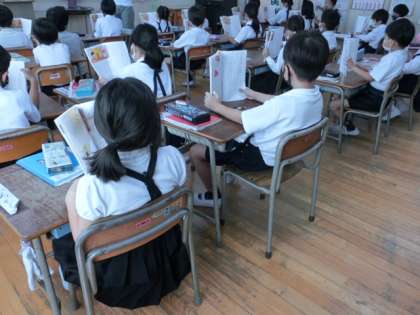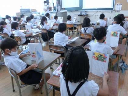 3限に、1年1組の国語の授業におじゃましました。「サラダでげんき」という物語の授業です。病気のおかあさんのために、りっちゃんがさまざまな動物たちにアドバイスをもらいながら美味しそうなサラダをつくるお話。元気よく音読し、先生の質問に活発に答えていました。授業の終わりに先生が、りっちゃんのつくったサラダを食べておかあさんはどうなりましたか?ときくと、声をそろえて「げんきになりました」と答えが返ってきました。楽しい授業でした。