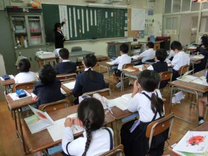 2年2組の国語の授業で、主語と述語を学ぶ文法の内容です。たくさんの先生が参観に訪れ、教育実習の先生だけでなく子どもたちもかなり緊張しているようすです。この1時間の教室にも「たくさんの一生懸命」があふれていました。