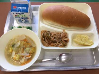 今日の給食は、■豚肉と野菜のケチャップソテー ■スープ ■スイートポテト ■コッペパン(ソフトマーガリン) ■牛乳 の献立でした。