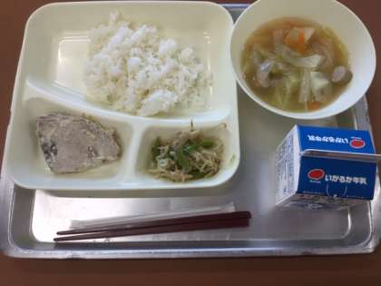 今日の給食は ■かつおのマリネ焼き(ノンエッグドレッシング) ■ウインナーと野菜のスープ ■もやしとピーマンのソテー ■ごはん ■牛乳 の献立でした。