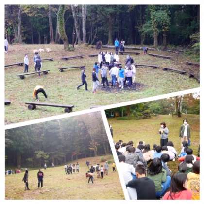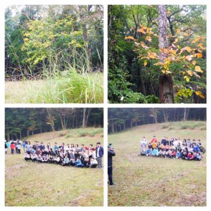 室内レクをおこなおうと体育館に移動しましたが、つかの間の天気の回復をねらって、宿舎横の広場に出ました。みんなで集合写真を撮って、あとはしばらく自由に野原を駆け回る時間です。昆虫を捕まえたり、ファイヤー場に行ってみたり。みんなでのびのび遊んだ後は、昨日の山登りの後に楽しむために用意されていた「おやつセット」で憩いのひと時です。