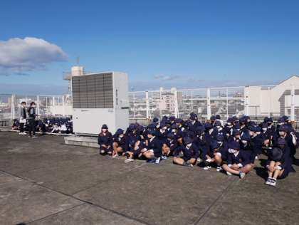 机の下で危険を回避。まず3階以上に避難。さらに大きな津波から逃れるために屋上に避難。3ステップの避難訓練です。「押さない・走らない・しゃべらない」いつもの注意点をあらためて確認しました。