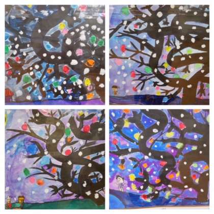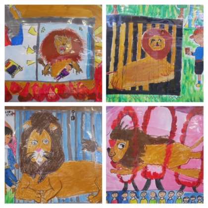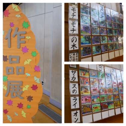 3年生の展示作品は、「サーカスのライオン」「モチモチの木」のそれぞれの物語の世界を表現する絵です。細部にまで気を配って美しく仕上げられています。きくと、毛筆・色えんぴつ・水彩絵の具を使い分けて仕上げていったとのこと。じっと目をこらして細かな部分まで鑑賞してほしいです。