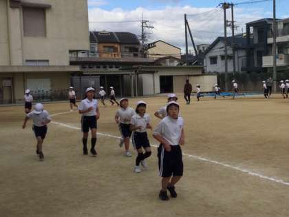 写真は4年生の1コマです。10分間走。1周約100メートルのトラックを、よく走る子は20周以上走るということです。タイマーをかけての周回です。のこり時間がわずかになると「がんばれ」という声援がとんでいました。