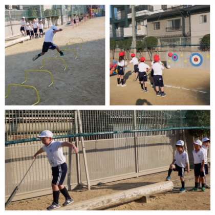 身体のバランスをとりながら「8の字走」、「へいきん台歩き」の後で「ミニハードル」、「ボール壁あて」で投てき運動もおこないます。さらに、「揺れる板歩き」の後で「170センチの板をめがけてジャンプ」---笛の合図で種目を入れかわってトレーニングします。楽しく体を動かせば、気持ちもすっきりとします。