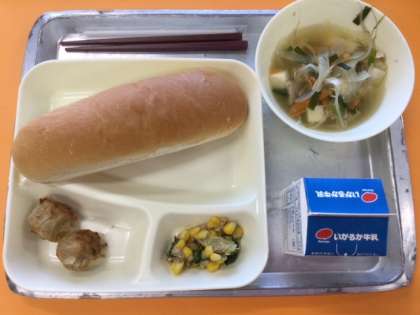 今日の給食は、■あげシューマイ ■とうふのスープ ■ツナとチンゲンサイの炒め物 ■パン ■いちごジャム ■牛乳 の献立でした。今日も美味しくいただきました。