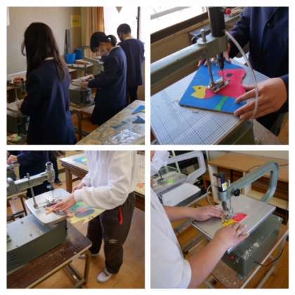 5年生が図工の時間に初めて「電動の糸のこぎり」を使いました。糸のこぎりは細かな作業をするためののこぎりですが、なんといっても電動なので、慣れるまでにはずいぶんと緊張します。ちょっとしたひょうしにずれてしまうと、もう後には戻ることはできません。