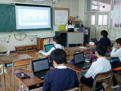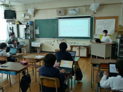 4年生の授業をのぞきにいくと、国語の調べたことを発表する学習で、「1人1台端末」を活用した発表をおこなっていました。