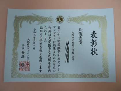 ライオンズクラブ主催の国際平和ポスターコンテストに応募した作品から、6年生児童1名の作品が最優秀賞・金賞に表彰され、また、6年生児童1名・5年生児童2名が優良賞に表彰されました。