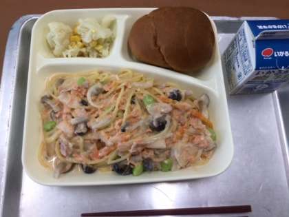 今日の給食は ■さけのクリームスパゲッティ ■カリフラワーとコーンのサラダ ■ハーフパン ■牛乳 の献立でした。