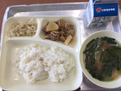 今日の給食は ■豚肉のコチジャンいため ■トック ■もやしのナムル ■ごはん ■牛乳 の献立で、韓国風です。
