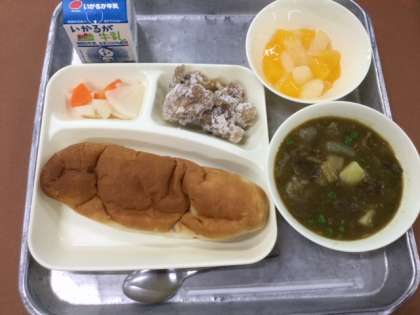 ☆フライドチキン ☆近江牛のカレーシチュー ☆お祝いピクルス(紅白) ☆フルーツゼリー ☆パン ☆牛乳 の献立で、豪華です。