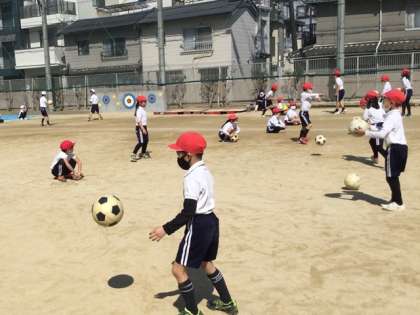 つづけて2年生の体育におじゃましてみると、サッカーの練習です。リフティングにチャレンジしていますが、これは難しい。なかなかボールがまっすぐに足にあたりません。それでも何度も何度もくりかえしていると、少しずつコツをつかんできます。