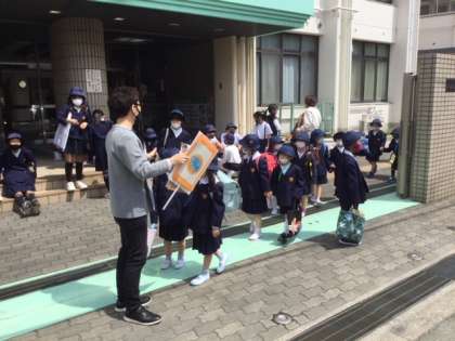 子どもたちの下校を見守りましたが、朝の不安げな表情と異なり、元気よく楽しそうに帰っていったので、明日を楽しみにできる初日だったんだなと思いました。1年生はしばらくの間、先生と一緒に集団下校をおこないます。