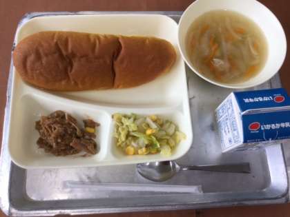 今日のこんだては、ぶた肉のデミグラスソース、スープ、キャベツとコーンのソテー、パンプキンパン、牛乳です。よくかんで残さず食べましょう。