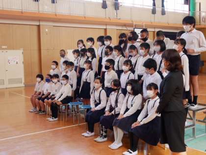 写真は6年生の撮影直前のようすですが、1年生から順に、写真屋さんに言われたとおりにきれいに並び、服装を整え、背筋をピンと伸ばして撮影します。準備が整ったら、みんなで一斉にマスクをはずしてニッコリ。こういう集合写真ではついついこわばってしまって上手く笑えないものですが、写真屋さんのテンポのよい掛け声に絶妙の間があって、自然と笑ってしまいました。さあ、どんな写真に撮れているかな。