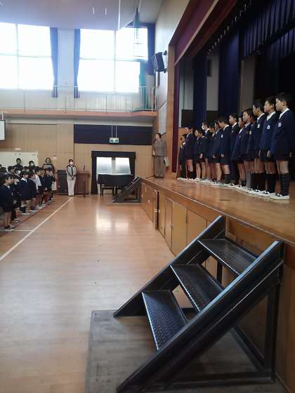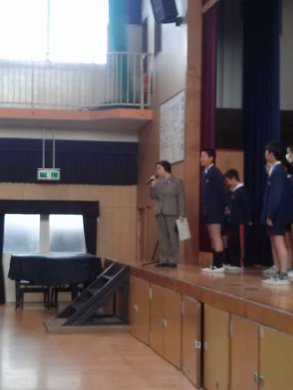 今朝の朝会は、講堂で行われました。読書感想画、読書頑張り賞や教育長表彰の紹介がありました。