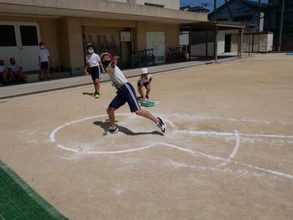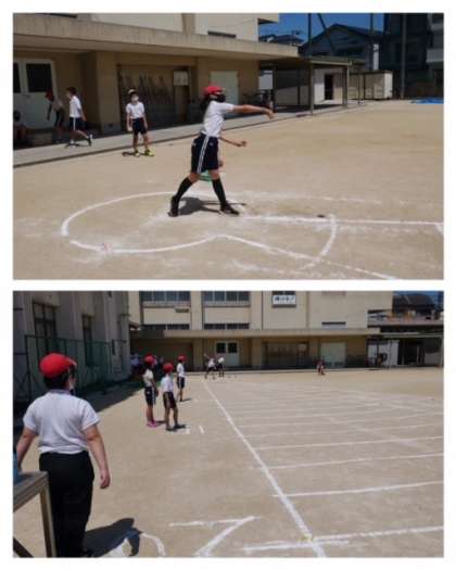 通常授業の再開後、各学年で「体力テスト」を少しずつ進めています。写真は6年生の「ソフトボール投げ」のようすです。昨日の放課後に先生たちが準備した「フィールド」を使って力いっぱい投げました。