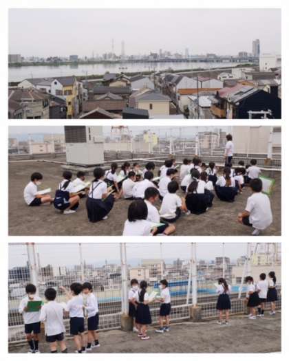 3年生は屋上にあがって学校の周囲にあるものを観察していました。屋上から眺めてみると、見慣れているはずの風景がずいぶんと違って見えます。淀川の大きさに圧倒される思いです。大きな工場・会社があったり、遠くにはあべのハルカスが見えていたり。自分の家が見つけられて大喜びの子どもたちもいました。
