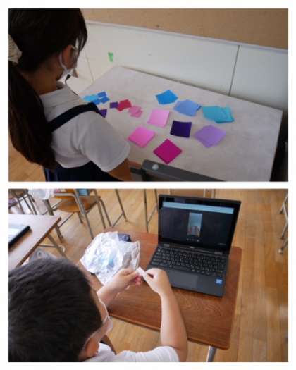 2年生は視力検査と並行して、折り紙であじさいを折っていました。好きな大きさと色の折り紙を選び、1人1台パソコンで先生の手元を映した動画を見ながら折っていきます。とても分かりやすいです。