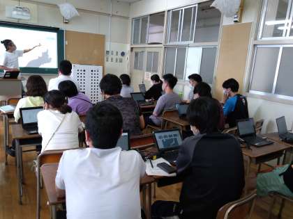 通常授業が再開されましたが、一人一台の端末をより有効に活用していくための勉強会です。子どもたちの吸収力に負けないよう先生たちもがんばっています!