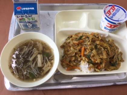 今日の給食は ●和風カレー丼 ●もずくとオクラのとろり汁 ●ヨーグルト ●牛乳 の献立でした。