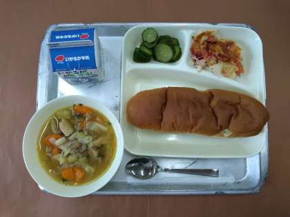 ●鶏肉とてぼ豆のスープ煮 ●じゃがいもとトマトのチーズ焼き ●きゅうりのサラダ ●おさつパン ●牛乳 でした。