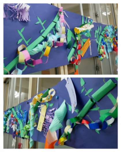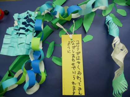2年生の笹は手づくりです。色画用紙をきれいに切ったり丸めたりしてつくりました。そして、それぞれの思いを込めた短冊。子どもたちの願いがかなうことが学校の願いかもしれません。
